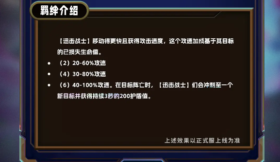 (6)40–100 % Angriffsgeschwindigkeit. Wenn das Ziel stirbt, sprinten [Schnelle Krieger] zu einem neuen Ziel und erhalten einen 200-Schild, der 3 Sekunden lang anhält.