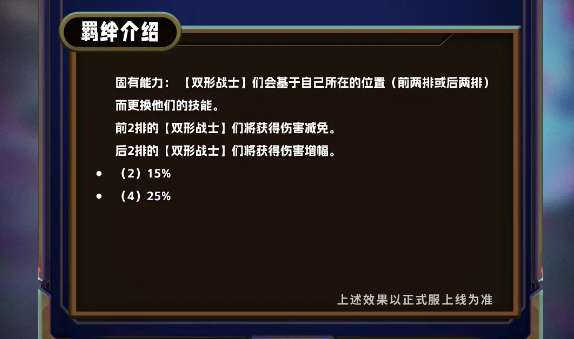 Effektgewinn : Inhärente Fähigkeit: [Doppelkrieger] ändern ihre Fähigkeiten basierend auf ihrer Position (die ersten beiden Reihen oder die letzten beiden Reihen). Die [Doppelkrieger] in den ersten beiden Reihen erhalten eine Schadensreduzierung. Die [Doppelkrieger] in den letzten beiden Reihen erhalten eine Schadenserhöhung.