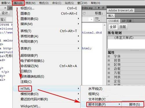 5. Klicken Sie in der Menüleiste auf „ Einfügen “ und wählen Sie im Popup-Dropdown-Menü „HTML“ – „ Skriptobjekt “ – „ Skript “.