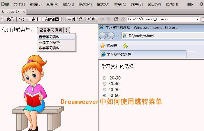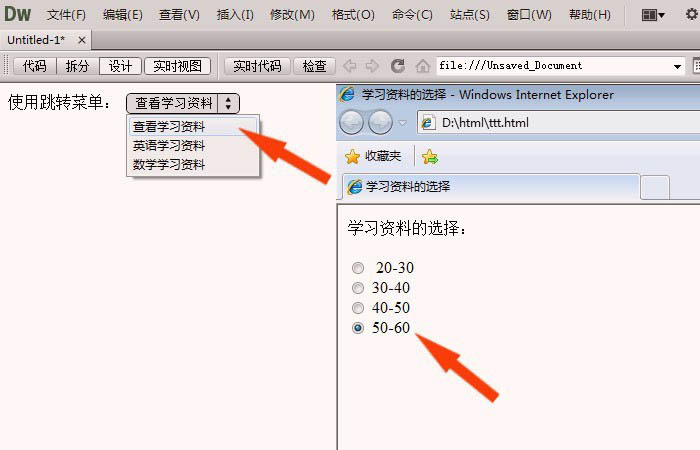9. Klicken Sie abschließend mit der linken Maustaste auf das Fenster [ Live-Ansicht ], um das vorbereitete Sprungmenü anzuzeigen. Sie können auf klicken, um zur Webseite zu springen und den Anzeigeeffekt der Webseite anzuzeigen, wie in der Abbildung unten dargestellt. Auf diese Weise wird das Sprungmenü im Formular hinzugefügt. Klicken Sie mit der linken Maustaste auf [Speichern].