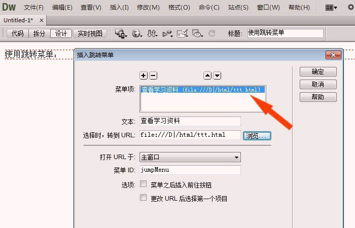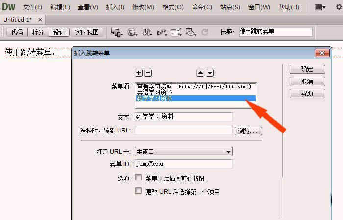 5. Fügen Sie dann im Fenster [Sprungmenü] die Parameter der Webseite hinzu, die zum Menü gesprungen werden soll, wie in der Abbildung unten gezeigt.