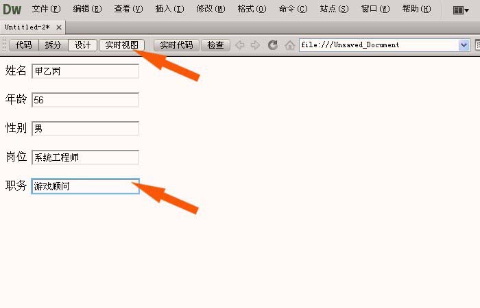 10. Klicken Sie abschließend mit der linken Maustaste auf das Fenster [ Live-Ansicht ], um das von Ihnen erstellte einfache Formular anzuzeigen. Sie können Text in das Formular eingeben und den Anzeigeeffekt anzeigen, wie in der Abbildung unten dargestellt. Das einfache Formular ist nun erstellt. Klicken Sie im Menü [Datei] mit der linken Maustaste auf [Speichern].