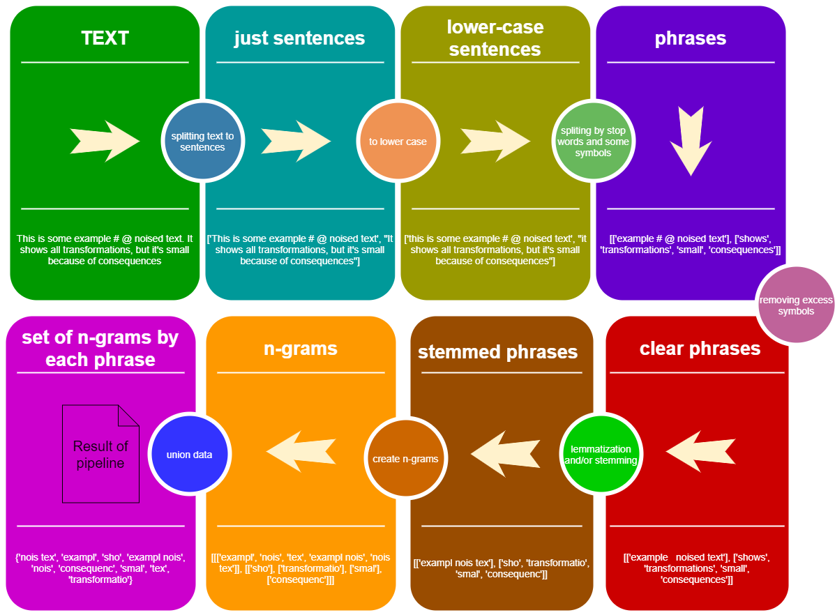 print(total_set == pipe(text_example)) # truefrom StemLemPipe import phrases2lower, phrases_without_excess_symbols, phrases_transform, text2sentences, split_by_words, sentence_split, create_stemmer_lemmer, words_to_ngrams_list, sum_phrases, wordlist2set, stopwords, StemLemPipeline