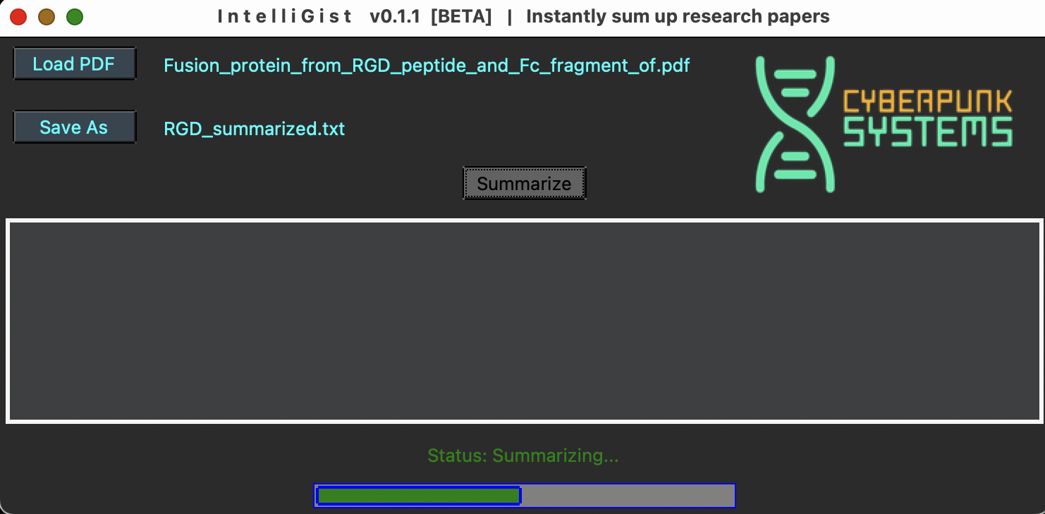 IntelliGist is a Mac application that elegantly and cohesively summarizes any .pdf input of any research paper of any length. This is achieved despite the context length limits of GPT. Unlike other apps which claim to do the same thing, the end result is not simply a concatenation of smaller summaries. Rather, mixed AI techniques and utilities are used to generate one solid final essay of around 500 words that reflects the structure of the paper.