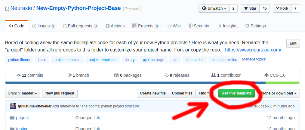 You can now automatically create a new project based on this template by clicking here on Use this template, or by clicking on the button above in the repo, as depicted in the image below. If you don't use GitHub, you may as well simply clone this repository.