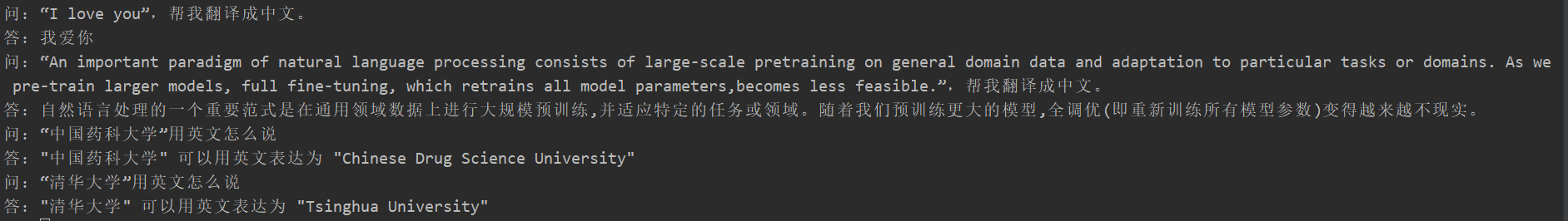Note: The Lora method only saves the Lora training parameters when saving the model, so the model parameters need to be merged when predicting the model. For details, please refer to merge_lora.py.
