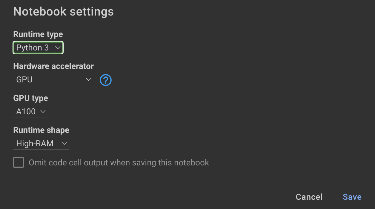 Training the model requires GPUs and high RAM. If your local machine does not support this, you can use Colab Pro with the following specs: