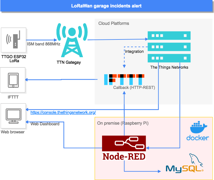 The backffice part is supported by The Thing Networs (AKA TTN) and IFTTT. The information is finally processed in flows of a program in Node-Rred that runs in a Docker container on a Raspberry Pi 3B+ with the Raspbian operating system. The photo of this architecture would be this: