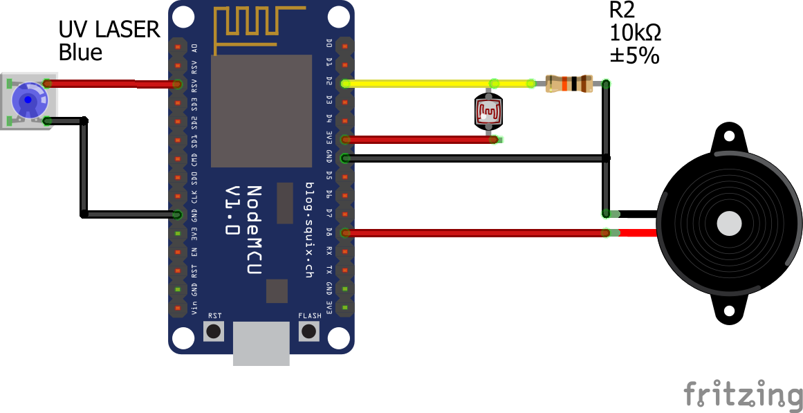 In this first iteration, the device only has a light sensor to detect the interruption of a laser beam in order to warn of a person's passage. Later we could include other movements such as a PIR (Passive Infrared Sensor). Or the connection are an image recording system, for example.