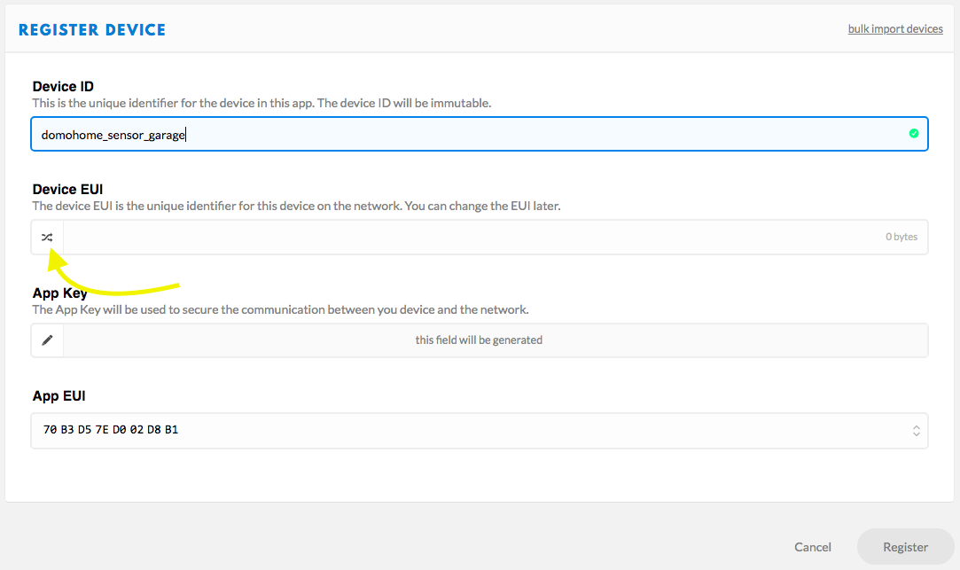 In TTN a device (Devide) represents the configuration of what also calls node (node) that is ultimately our circuit. When accessing the registration form, we only have to fill in the device ID that will be the unique name of this node. It is preferable to press the icon marked in the image so that the eui device is automatically generated.