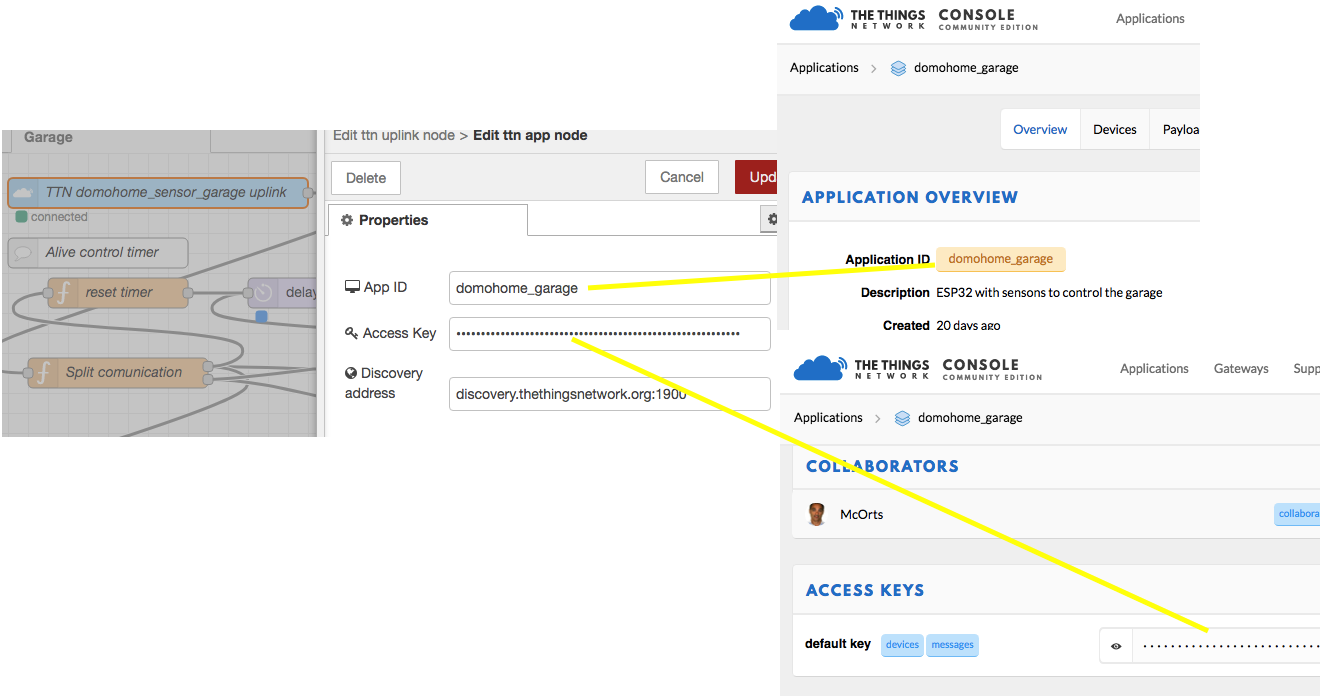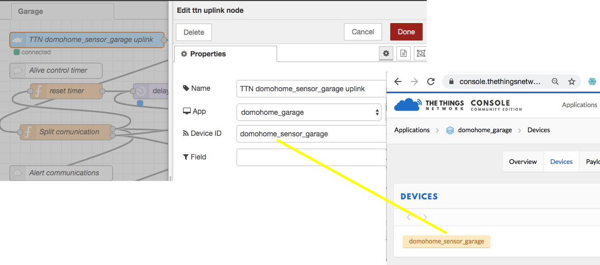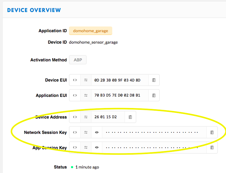 Open the properties of the TTN Domehome_Sensor_Garage Uplink node and look for names and the key on the TTN console according to the following correspondences: