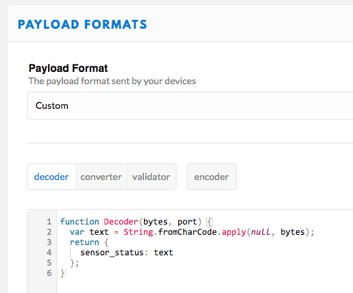 We will have to return to the Application Overbiew screen to make a last configuration. Pressing on the Payload Formats tab we access the form where a script is allowed to decode the data plot of our Lora message. In our case this is the format:
