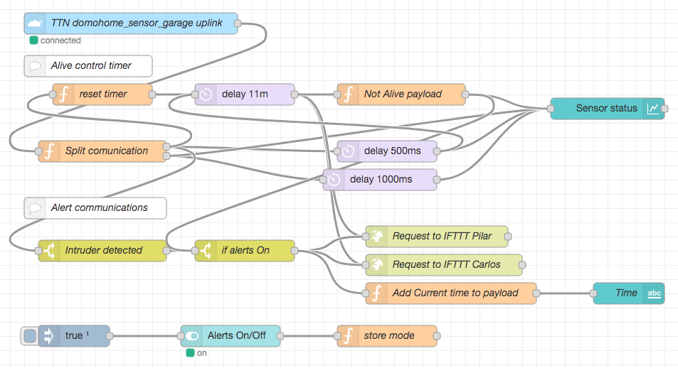 In the flow of Node-Rred, the messages delivered by the TTN service are treated and graphically show. The message payload contains two different values: ¨Alert¨ when the laser beam is interrupted and ¨Alive¨ every 10 minutes. In addition, a logic is included to show a state of not available when in 11 minutes no message has arrived.