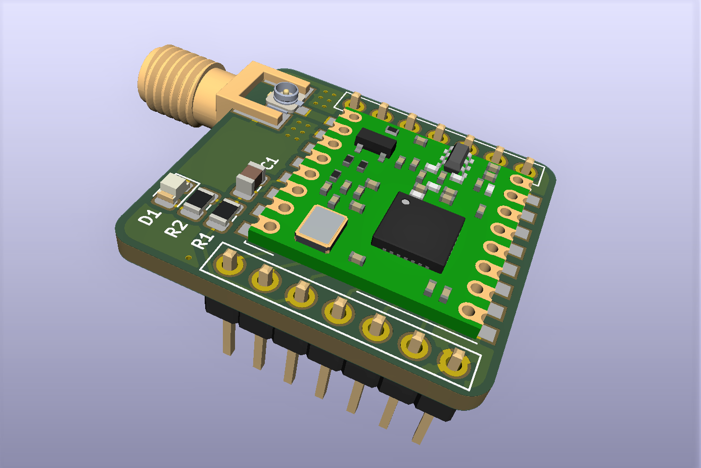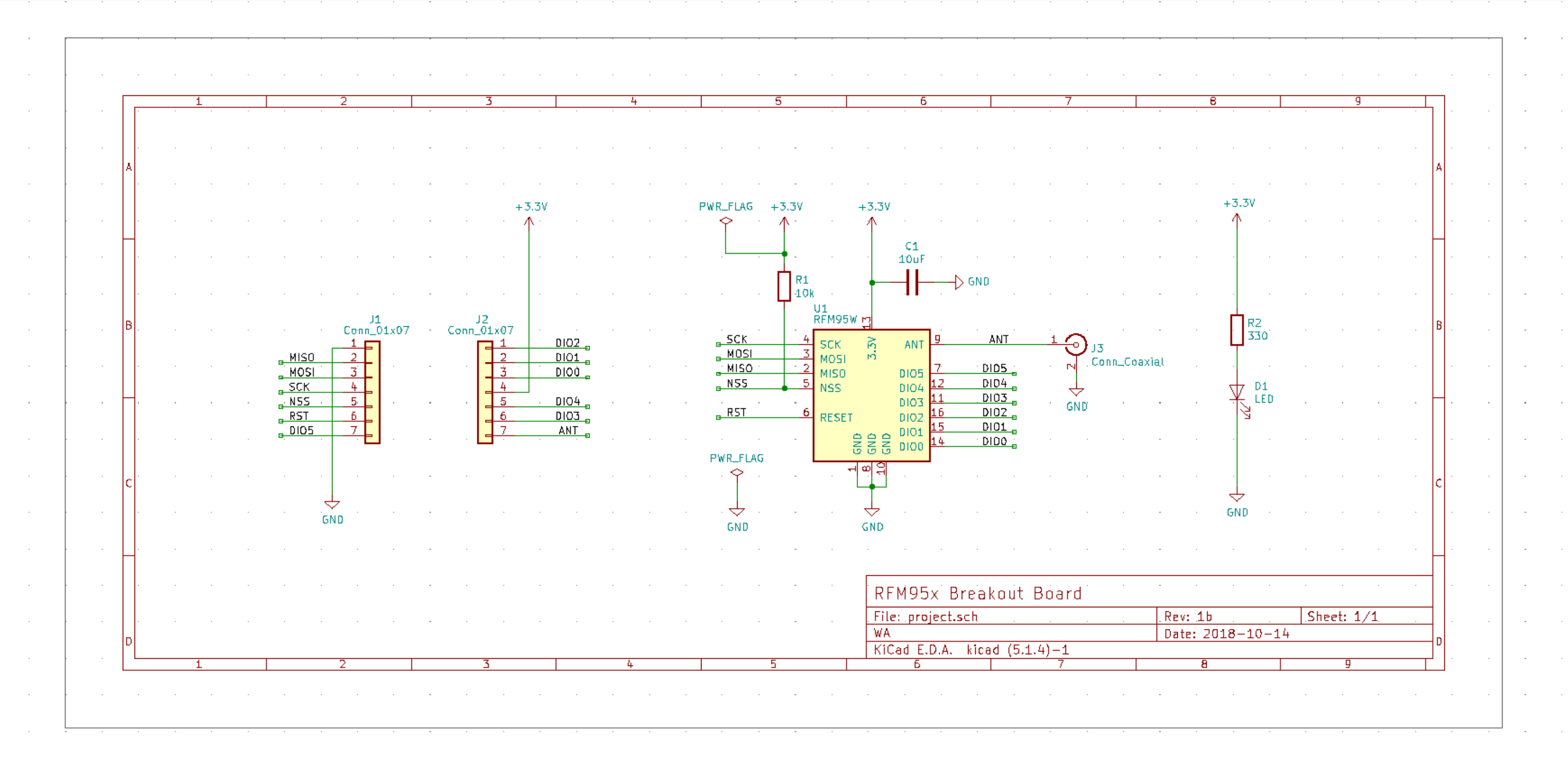 Nothing special on the schematic. The components R1, R2 and D1 are optional and can be omitted if not needed. R1 is used as pullup to keep high voltage level on the NCC pin. This allows programming the RFM95W/96W/98W module in case the board is interfaced to external microcontroller and ISP is used as a programming interface. R2 and D1 are used as power indication.