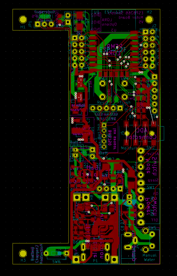 I learned the hard way about the electrical-noise sensitivity of the ESP8266: on V3 of the board, it would reboot whenever the watering motor was activated. I overcame this in V4 with component repositioning (moving the motor to the far end away from the microcontroller), adding extra capacitors next to the motor connection, increasing power trace width vs signal traces, minimizing loops on the ground plane, and separating the motor ground-plane return path from the rest of the components.