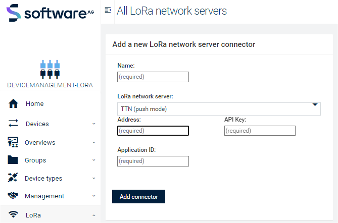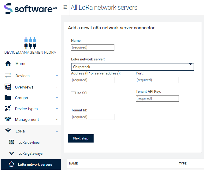 In devicemanagement-lora application go to menu LoRa/LoRa network servers. Simply give a name to your connector, then select the type of LNS you want to connect to (the type you're looking for will only show up if the corresponding microservice is installed).
