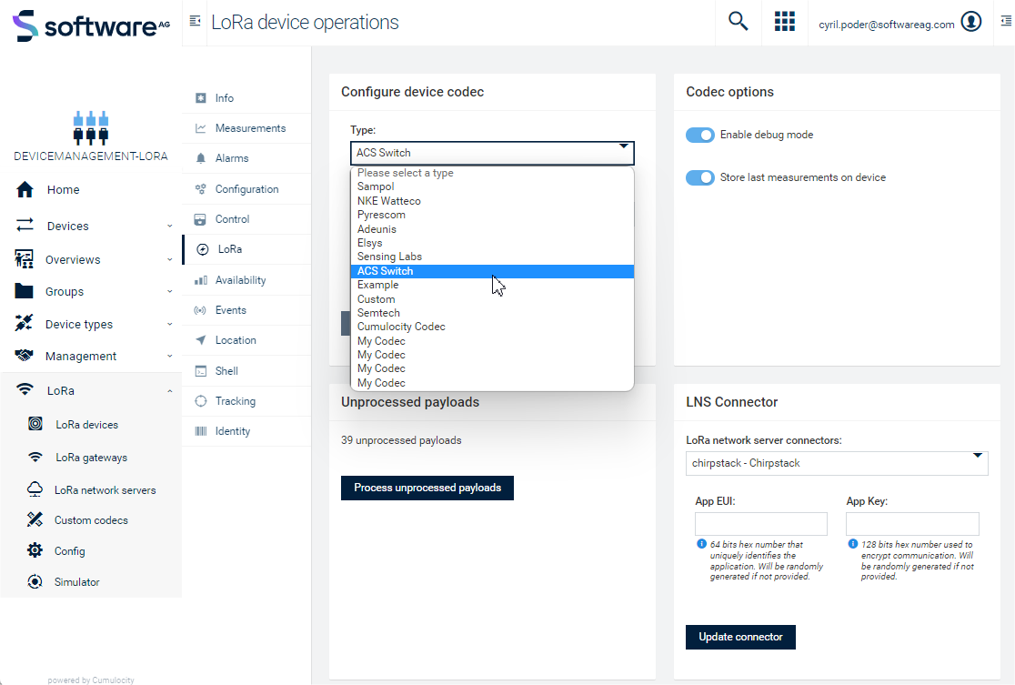 Once the connector is created, Cumulocity will automatically create an HTTP route in the LNS to push data from the LNS to the current Cumulocity tenant. Moreover, all existing devices in the LNS will be automatically created in Cumulocity once they send data and data are pushed to Cumulocity through the configured HTTP route. Those devices will be created without a codec associated to them, you will therefore need to go to the device detailed view in order to choose the right codec. Any payload sent to Cumulocity priori codec selection won't be lost: they will be stored and you will be able to process them once you have chosen the right codec.