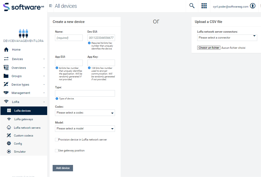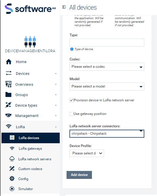 In devicemanagement-lora application go to menu LoRa/LoRa devices.