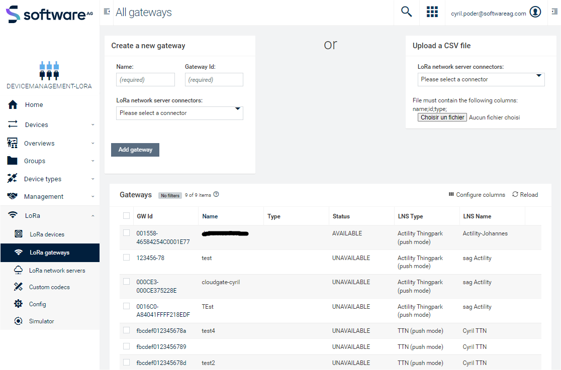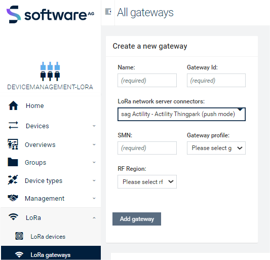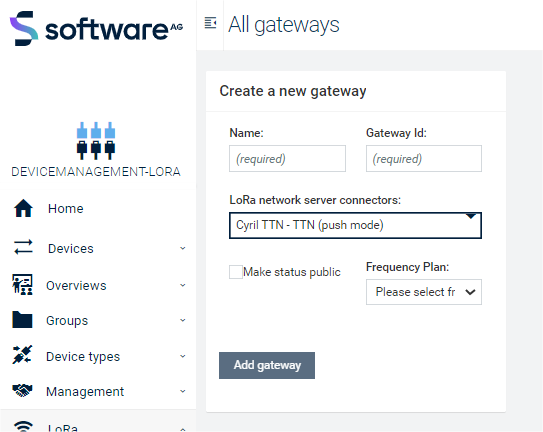 In devicemanagement-lora application go to menu LoRa/LoRa gateways.