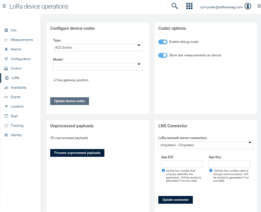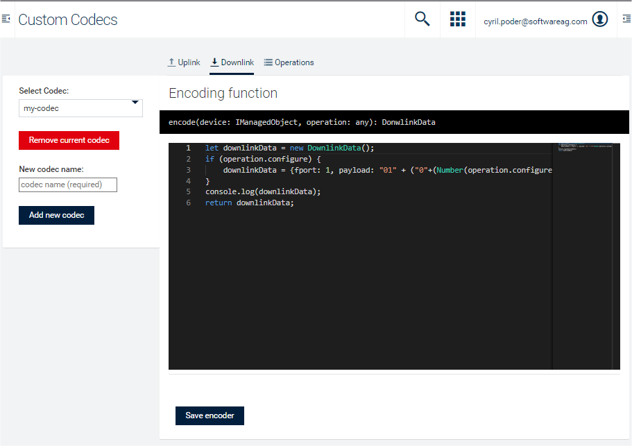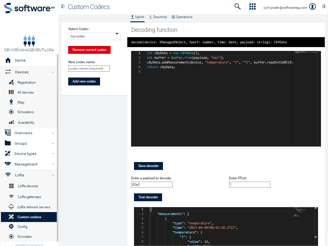 Once you're happy with your codec and you saved it, it will be accessible from any LoRa device Lora tab as a model of the custom codec.