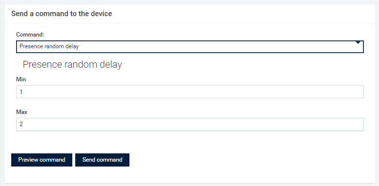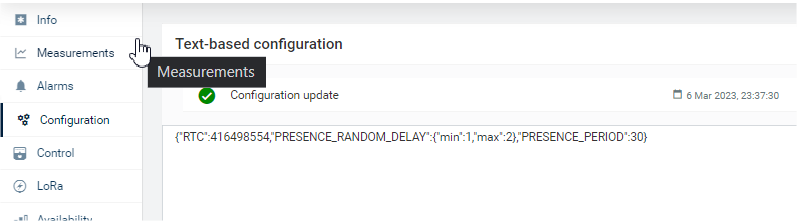 You can either update the device configuration by modifying the JSON directly or by sending a command from the LoRa tab. Commands available on the LoRa tab will have their input fields prefilled with the values stored in the device configuration: