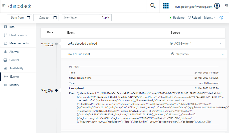 All LNS events will be available as events on the LNS connector managed object in their raw JSON format as sent by the LNS.