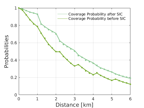 SIC increases the coverage probability up to 20% when the system radius is 6 km. A smaller improvement is observed at 12 km, since the noise (connection probability) is the primary cause of drop in performance.