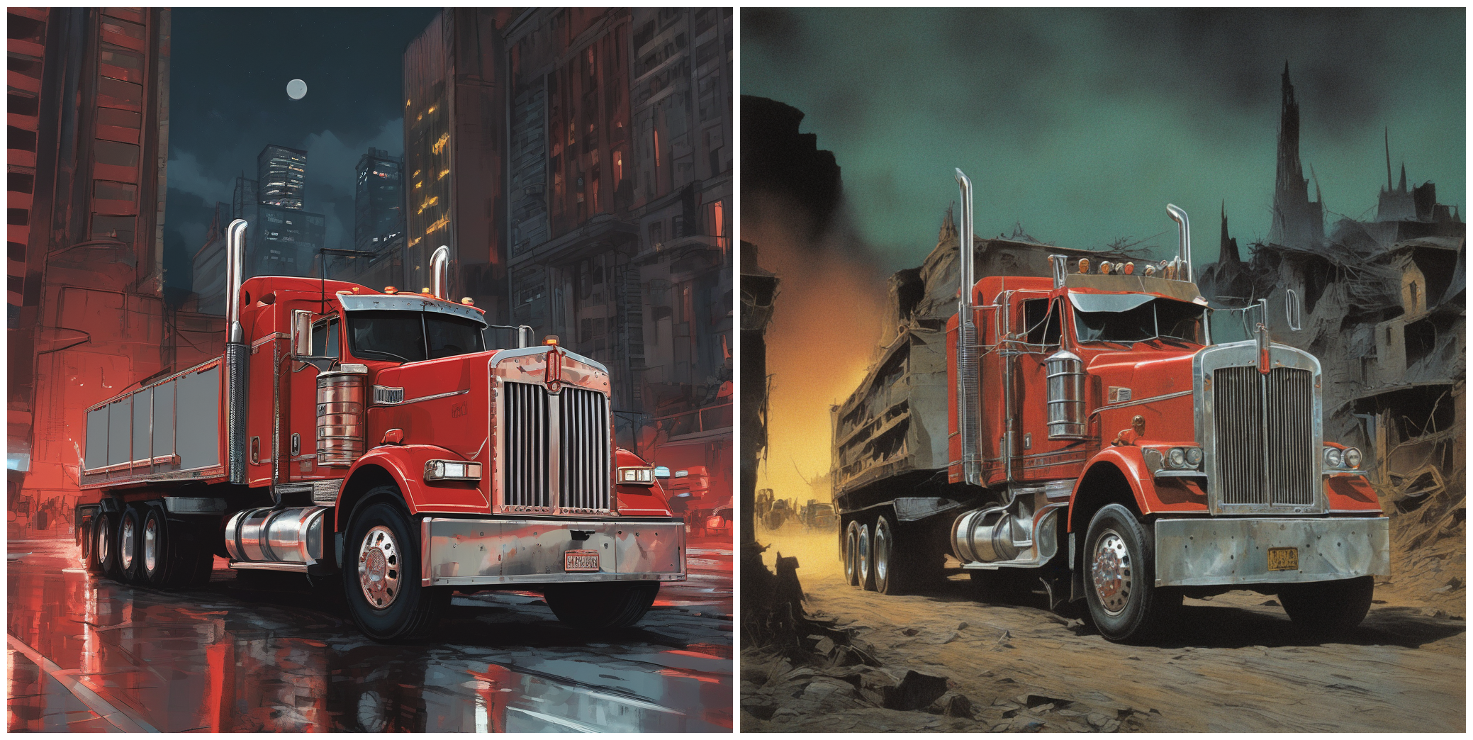 "A picture of a heavy red Kenworth truck riding in the night across the abanoned city streets."