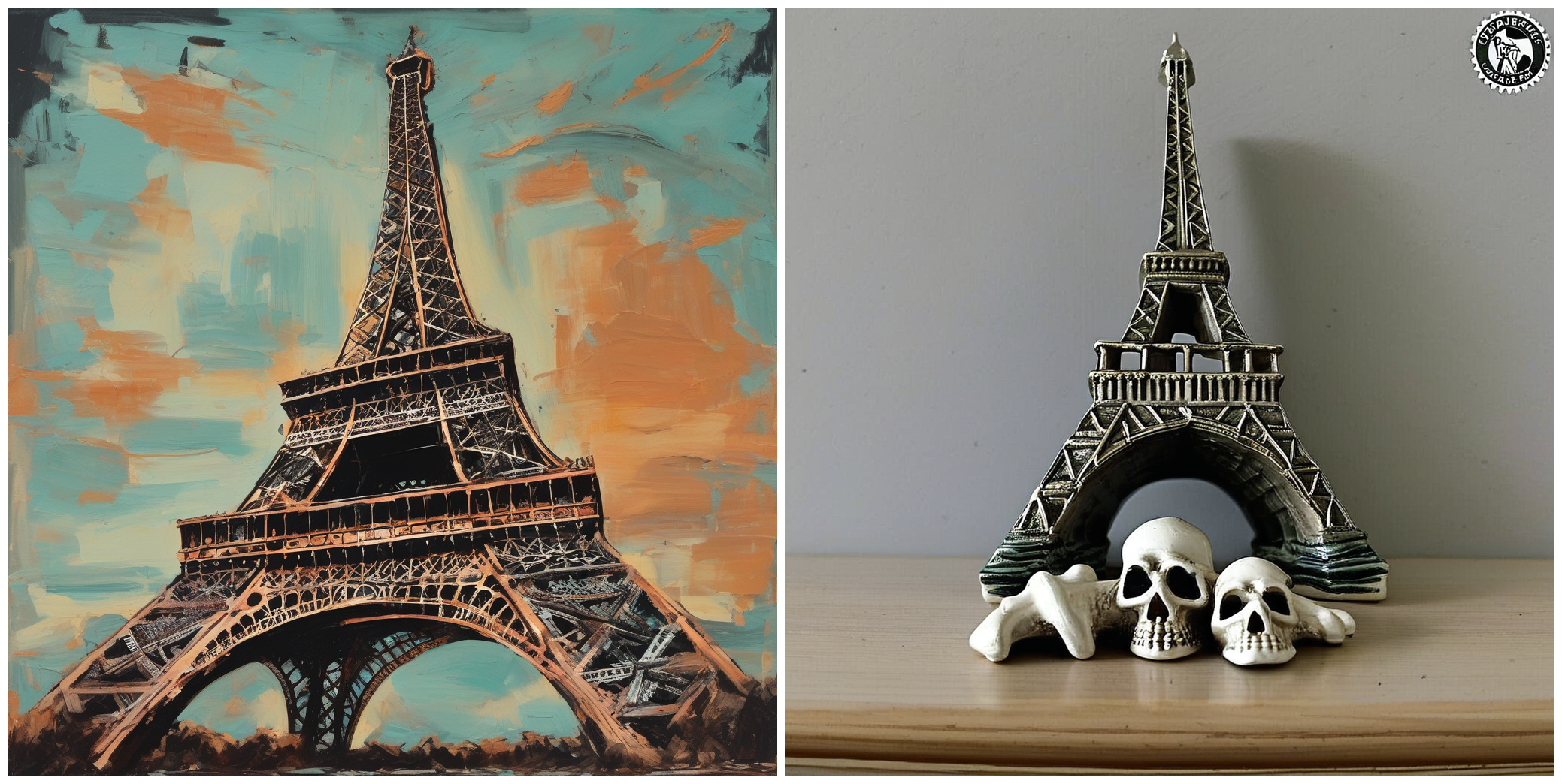 "A painting of Eiffel tower in the style of <skull_lamp>."