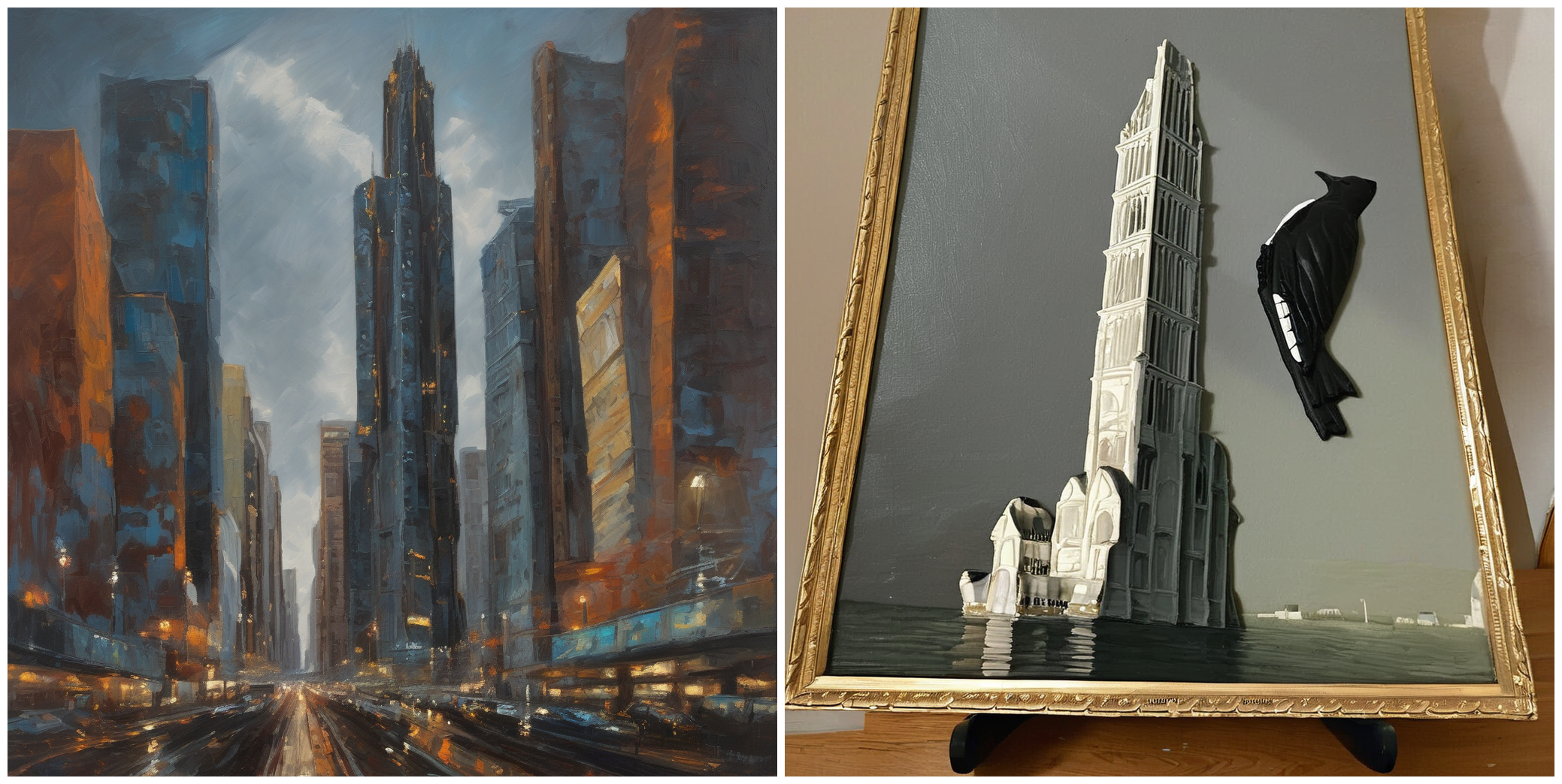 "An oil painting of a skyscraper in the style of <skull_lamp>."
