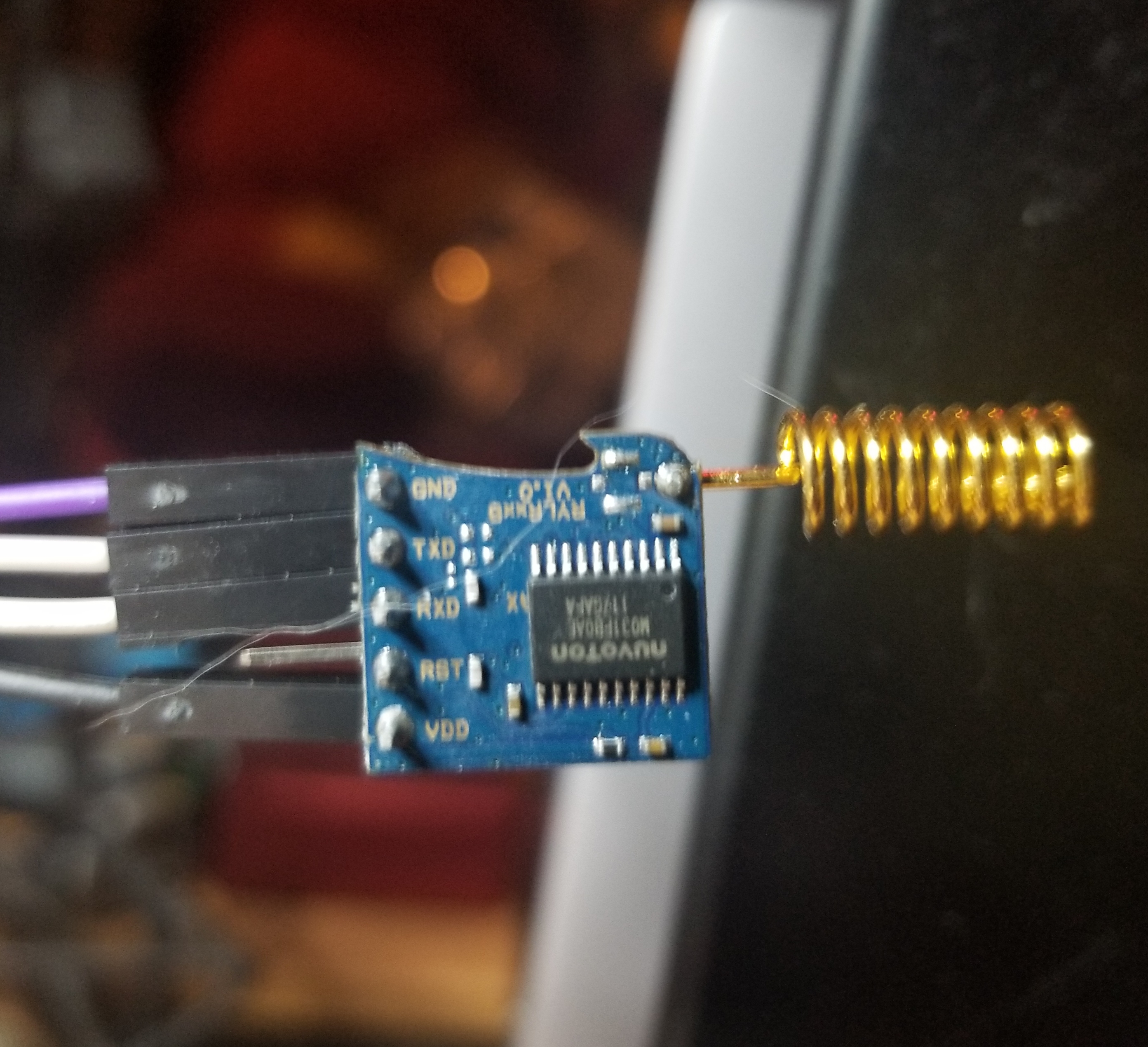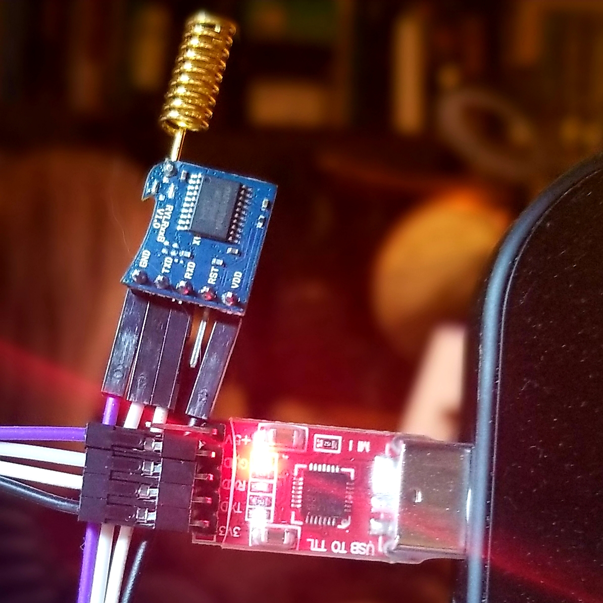 Similar to the GPIO, only VDD goes to the 3.3V output of the converter; RX and TX are swapped, as usual; and GND goes to GND. See the pictures below.