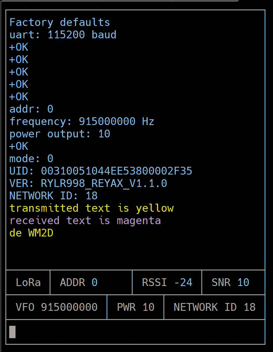 This is a work in progress. I'm taking my time adding IRC-like display functions with the Python curses library slowly and deliberately with all due sloth, so slowly that I would be fired and blacklisted if I were doing this professionally; flunked and expelled without a degree and a boatload of predatory private student loans at usurious interest rates if I were in college; and defunded and defrocked if I were an academician. I am not affiliated with Semtech Corporation.
