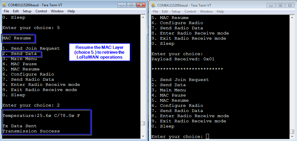 For this application, we will “Pause” the LoRaWAN MAC Layer (MAC) and use the LoRaWAN Radio Layer (TAL) for peer-to-peer communication and “Resume” the LoRaWAN MAC Layer to perform the LoRaWAN operations.