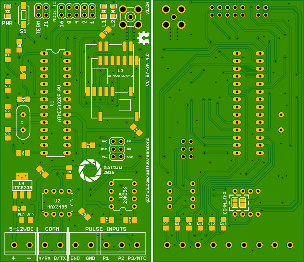 Pulse type nodes are intended to measure pulses from a water, electricity, gas or other kind of meter with pulse output. Nodes have three pulse inputs, one of which can be used as an NTC thermistor input instead of a pulse input. Pulse inputs are pulled high internally by microcontroller or with optional external resistors, and connected meter pulls it low to ground. Pulse values are periodically saved to EEPROM and restored on power-up. Pulse nodes require either regulated 3.3 volts or (unregulated) 5-12 volts DC power supply. They use the same PCB as the gateway.