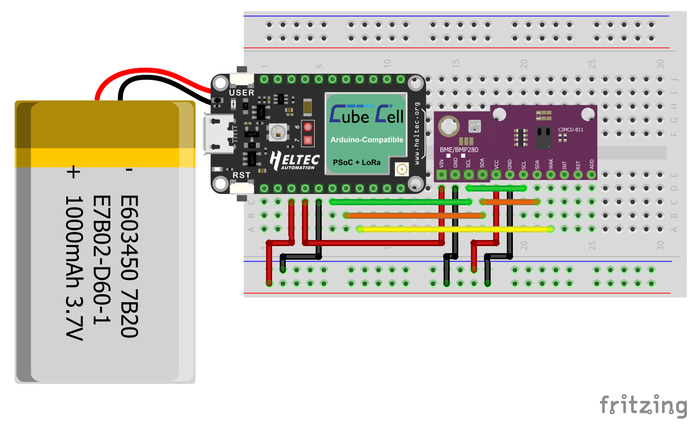 Taking into account that the program makes use of the Deep Sleep of the Cubecell, the BME280 sensor is put in Sleep between messages thanks to the VEXT pin can be governed ( high/low ), while CCS811, for its use of chemical agents to obtain the measures, connects to the static VDD pin (even in Deep Sleep it provides current), and it is the pin GPIO0 , connected to the pin WAK of the sensor, the one that emits a digital signal ( high/low ) that throws it to Sleep