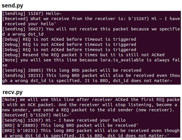 - One SX1276 can send a "REQ" packet (in a blocking way) and expect a specified SX1276 to respond with an "ACK" packet. This process is handled by this library.