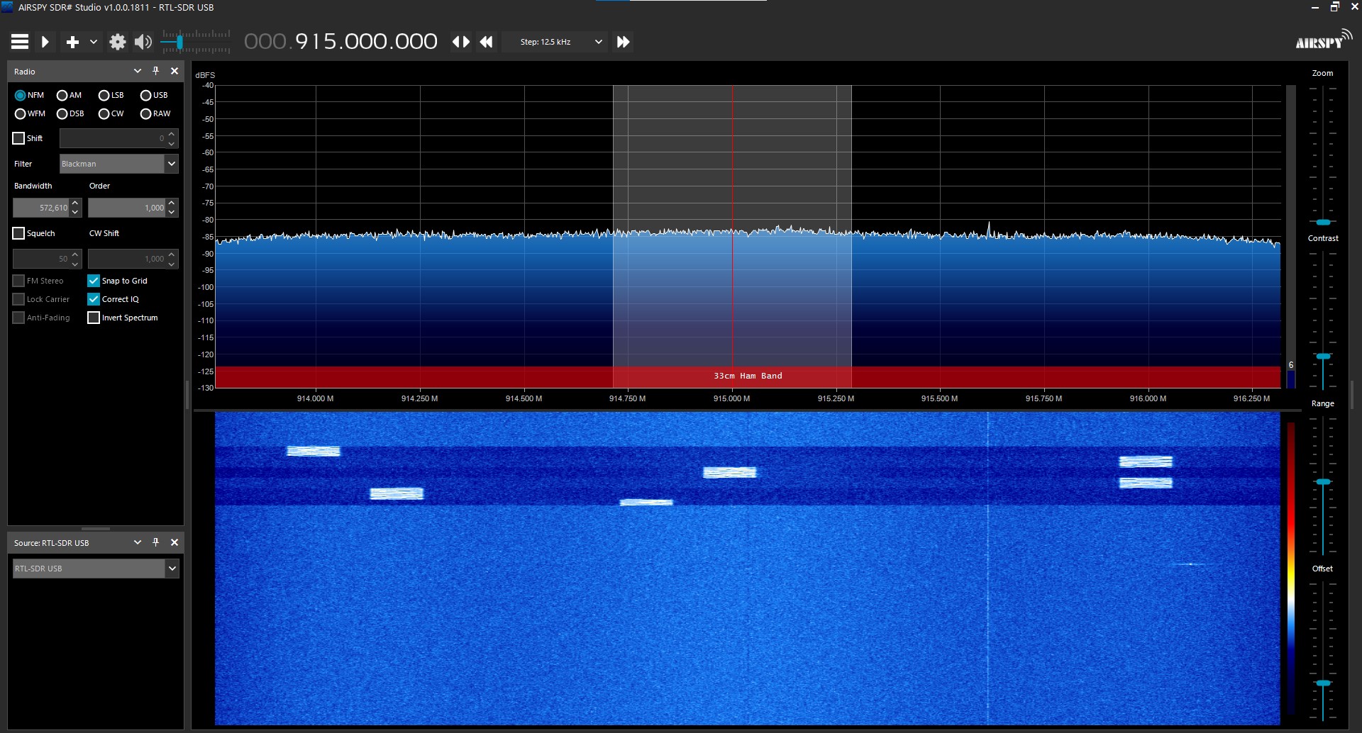 - To prove the point of frequency hopping, I use a RTL-SDR to monitor the spectrum. In following waterfall diagram, we see the signal hops between 914 and 916MHz as I programmed it to be.