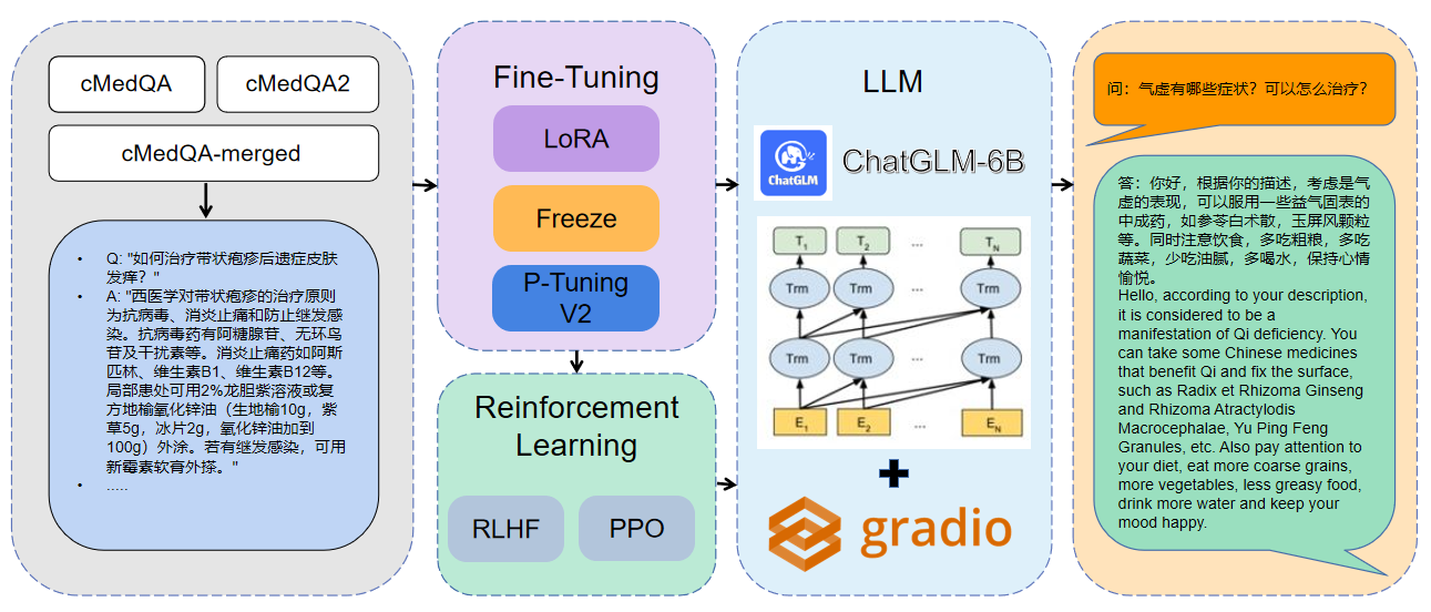 | DoctorGLM | CMD., MedDialog, ChatDoctor project dataset | ChatGLM-6B |