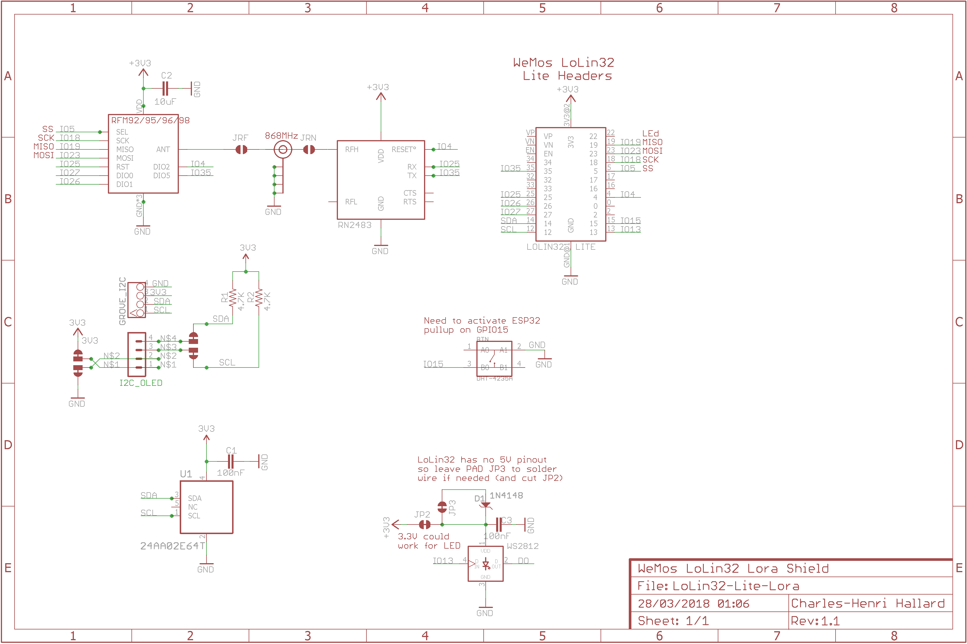 This shield is used to hold LoRa modules such as HopeRF RFM95 or Mictrochip RN2483 with WeMos ESP32 LoLin32-Lite boards it has the followong features: