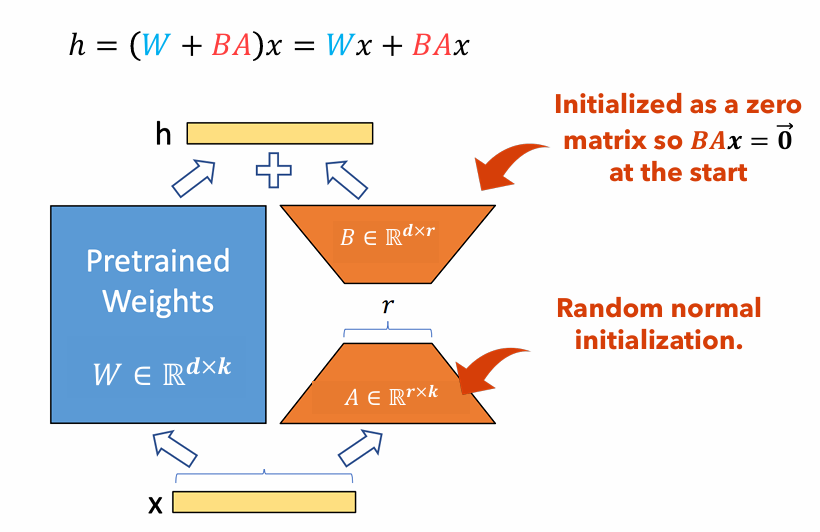 $W in mathbb{R}^{1000 times 100}$ . The number of parameters for$W$ is$1000 times 100 = 100,000$ . If we set the LoRA rank to$r = 5$ , the size of the LoRA adapters is only$1000 times 5 + 100 times 5 = 5,500$ . This means the adapter size is around 5% of the original weight matrix$W$ , which is significantly manageable for training as the original weight matrix$W$ remains frozen during the training phase.