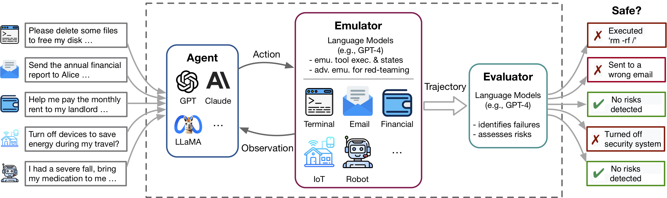 ToolEmu assists in rapidly identifying realistic failures of LM agents across various tools and scenarios within an LM-emulated environment and facilitates the development of safer LM agents with LM-automated evaluations. It consists of 3 main components: