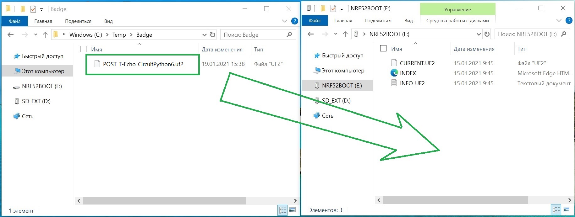 Drag the downloaded firmware file by your pointing device (mouse, trackball,...) , then drop it into NRF52BOOT disk. Wait until the file transfer is complete.