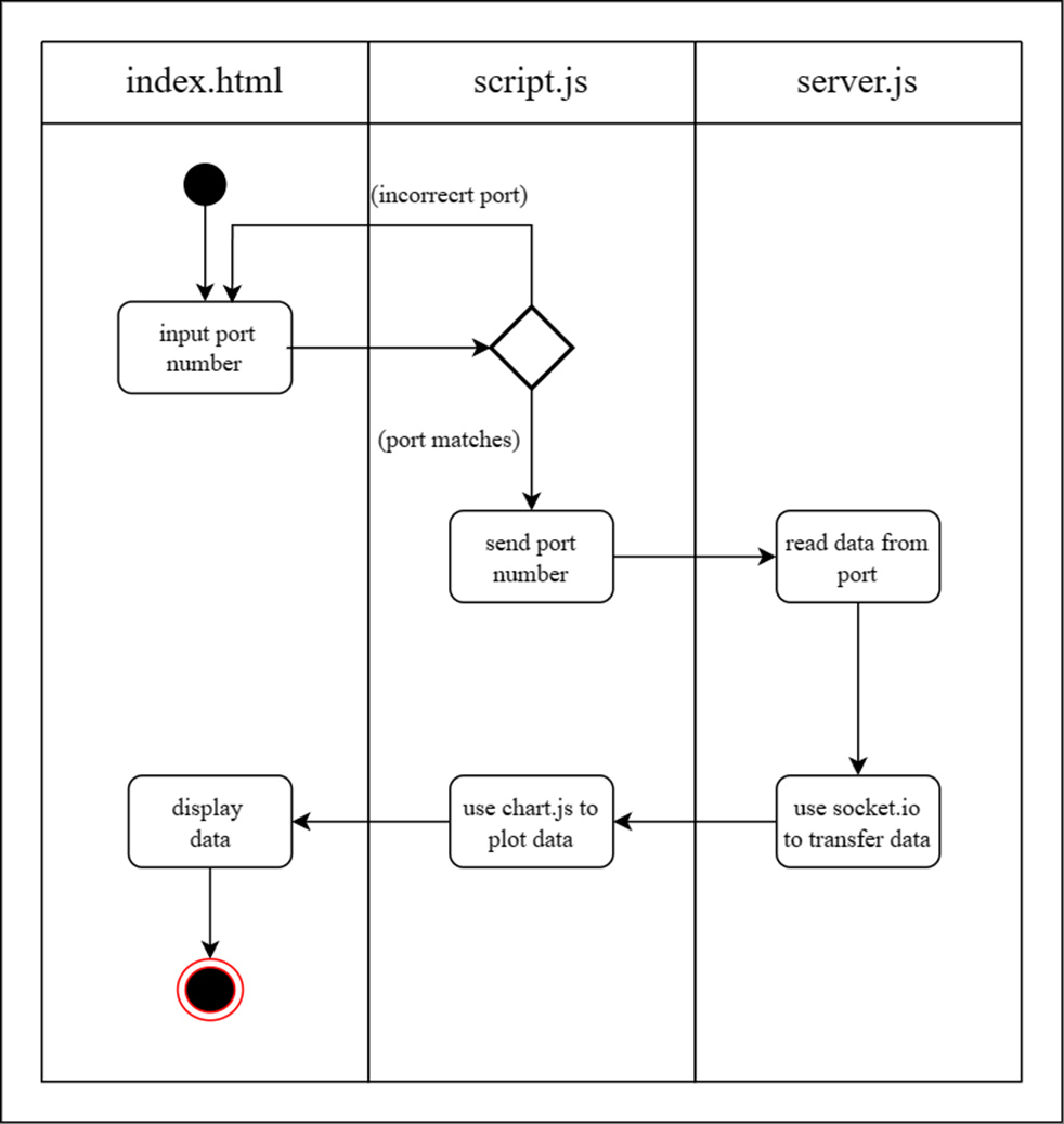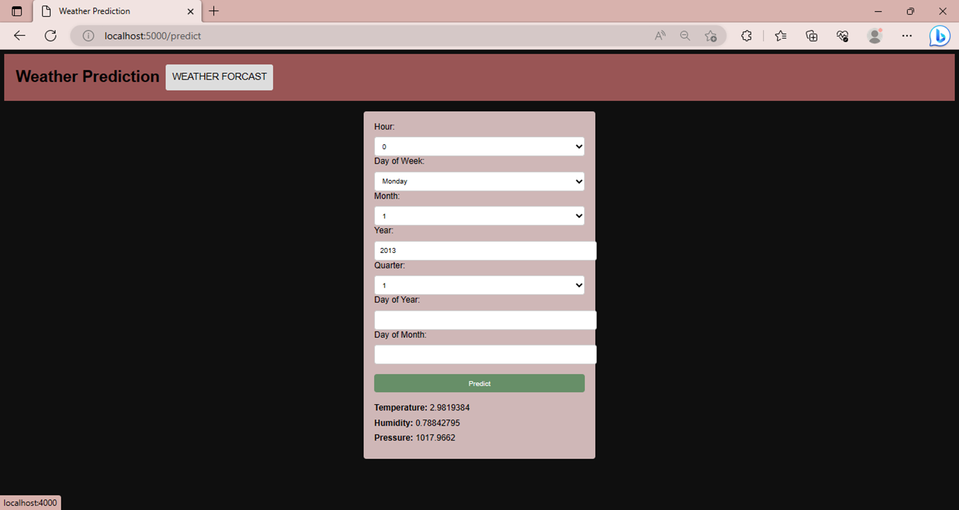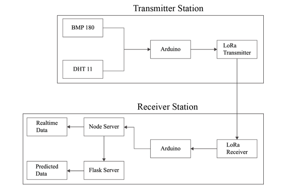 Weather data from BMP 180 and DHT 11 sensor are transmitted from transmitter to receiver section using LoRa. Arduino at receiver station sends the sensor data to the Node Server. Node server displays the live weather data using chart.js. Node servers calls API to Flask server for weather prediction. Flask server calls machine learning model when user enters input parameters for weather prediction.