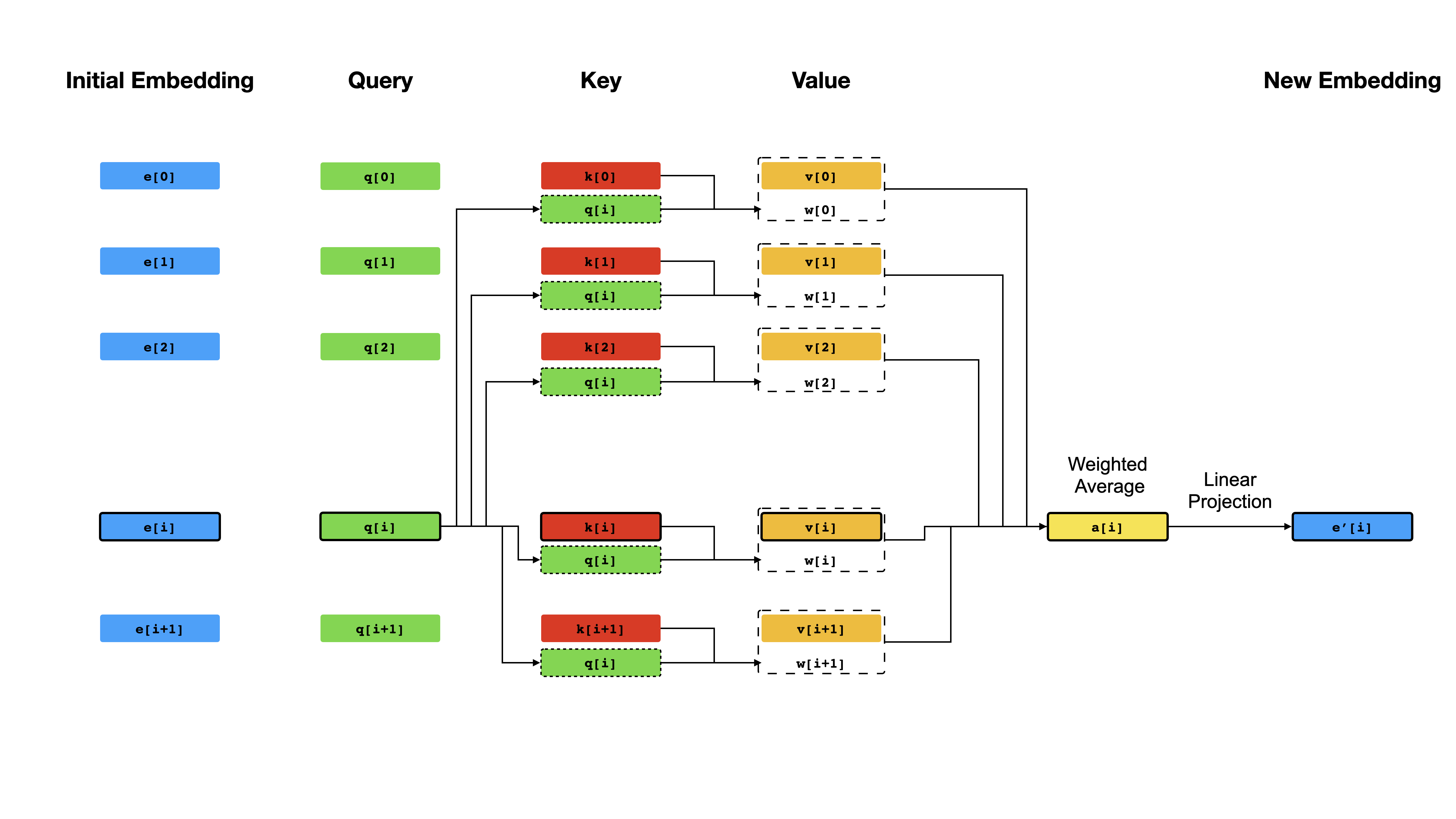 At the core of Transformer is the Self-Attention mechanism, where the goal is to compute a contextualized representation of each token in a sequence by letting them "pay attention" to each other. Given the initial vector representations e[i] for all positions i, it first applies linear projections to obtain vectors q[i], k[i], v[i], where k's and v's play the role of the key and value of a knowledge base about the sequence content, which is to be queried by q[i] to determine which tokens are most similar to the token at index i. The outcome of the query is simply the similarity scores between q[i] and k's (typically dot-products), which are used as weights to compute a weighted average of the v's as the new representation of e[i]. Note that q, k and v are derived from the same sequence, meaning the sequence is effectively querying itself (hence the name Self-Attention).
