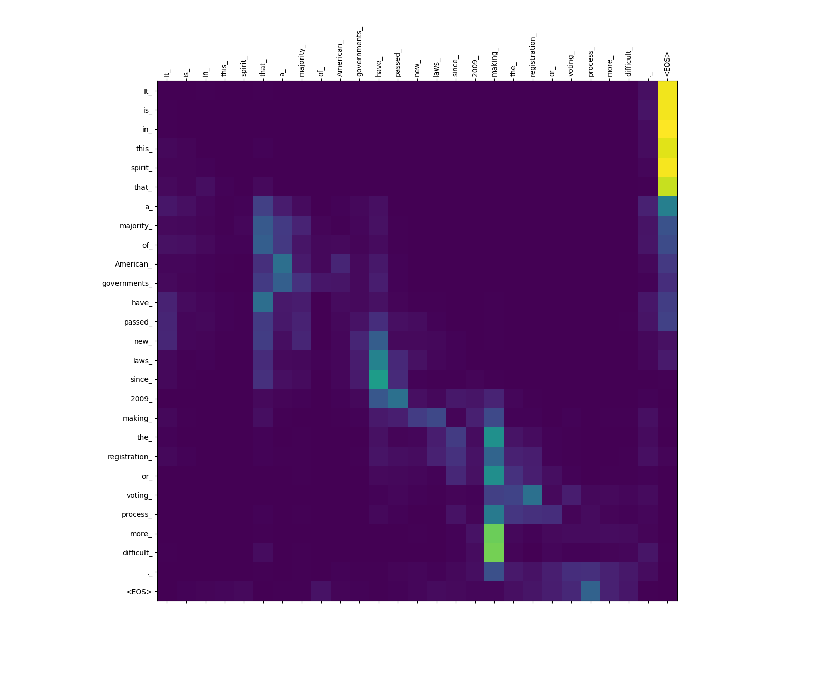 src: numpy array of shape [batch_size, src_seq_len], where each row is a sequence of token IDs that ends with 1 (EOS_ID) and padded with zeros.tgt: numpy array of shape [batch_size, tgt_seq_len], where each row is a sequence of token IDs that ends with 1 (EOS_ID) and padded with zeros.src_src_attention: numpy array of shape [batch_size, num_heads, src_seq_len, src_seq_len]tgt_src_attention: numpy array of shape [batch_size, num_heads, tgt_seq_len, src_seq_len]tgt_tgt_attention: numpy array of shape [batch_size, num_heads, tgt_seq_len, tgt_seq_len]The attention weights can be displayed by running: