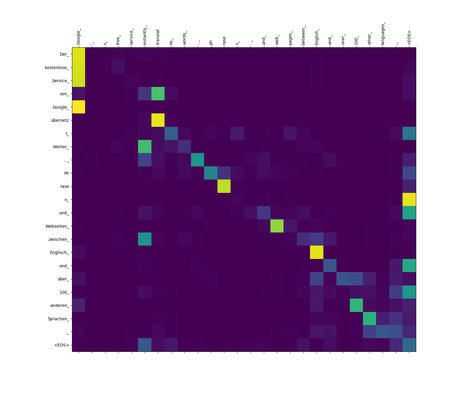 Notice the attention weight from übersetz (target) to translat (source), and from Webseiten (target) to web (source), etc. This is probably due to their synonymity in German and English.