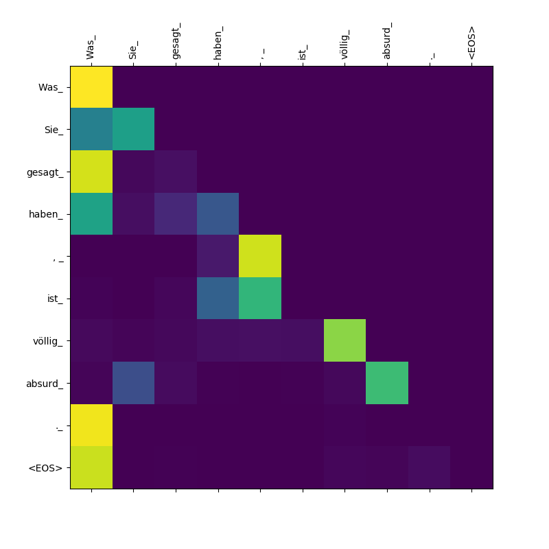 Notice the attention paid to Was by Was, Sie_, gesagt, haben_ -- as the decoder spits out these subtokens, it needs to "be aware" of the scope of the clause Was Sie gesagt haben (meaning "what you've said").