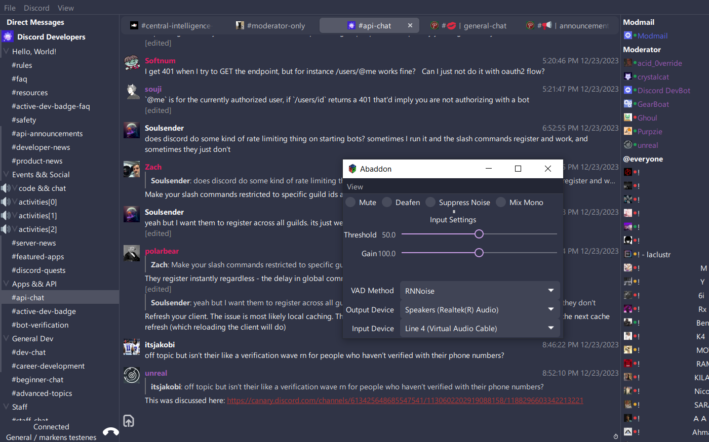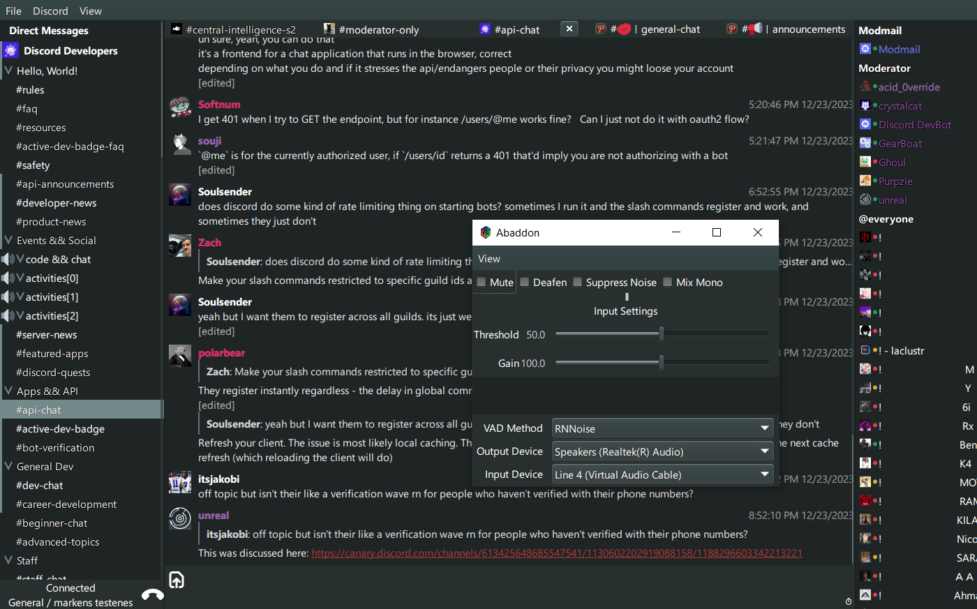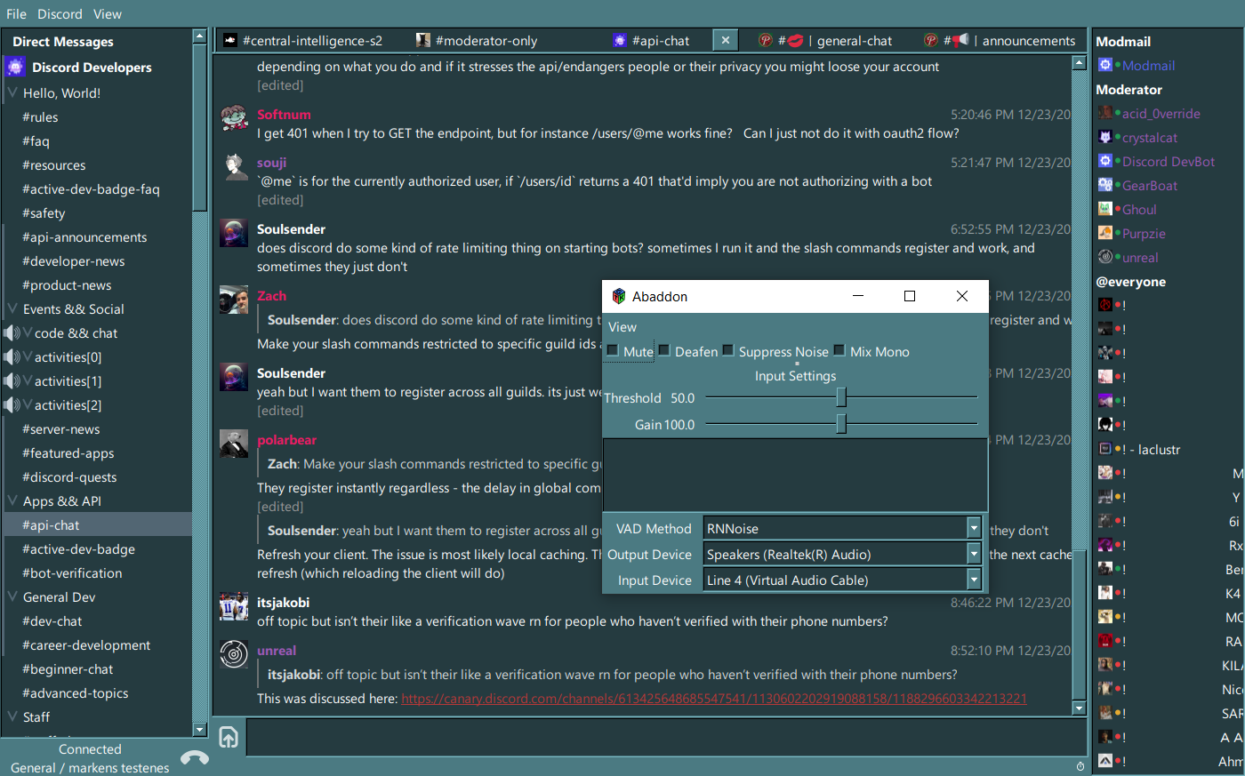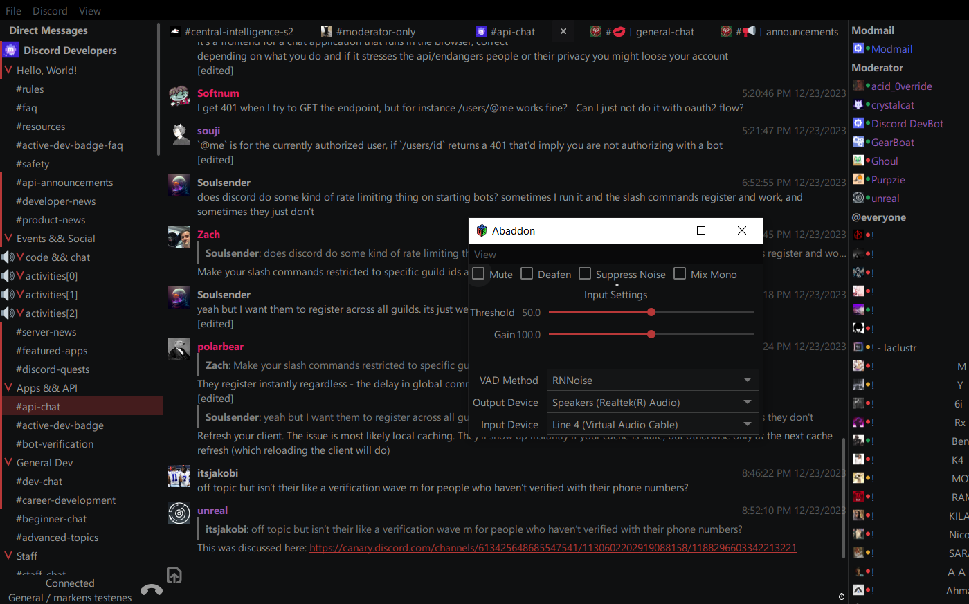 1 - Abaddon hace lo mejor que puede (aunque no es perfecto) para hacer que Discord piense que es un cliente web legítimo. Algunas de las cosas hechas para hacer esto incluyen: usar un agente de usuario del navegador, enviar el mismo mensaje de identificación que hace el cliente web oficial, el uso de puntos finales API V9 en todos los casos y no usar puntos finales que el cliente web normalmente no use. Sin embargo, todavía hay algunas inconsistencias más pequeñas. Por ejemplo, el cliente web envía mucha telemetría a través del punto final /science (Ublock Origin detiene esto), así como en los encabezados de todas las solicitudes.