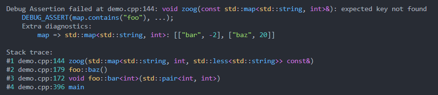 DEBUG_ASSERT (map. contains ( " foo " ), " expected key not found " , map);