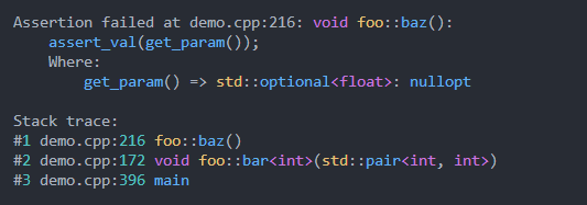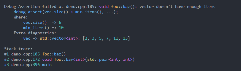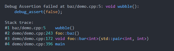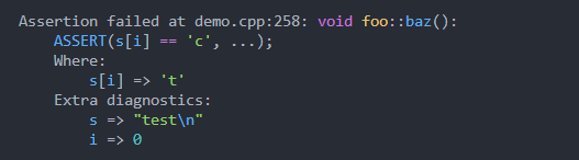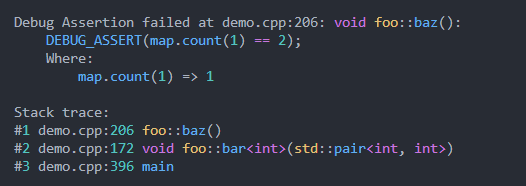 Por ejemplo con las afirmaciones de stdlib una afirmación como assert(n <= 12); No proporciona información sobre el fracaso sobre por qué falló o qué conduce a su falla. Proporcionar un rastro de pila y el valor de n Greatley mejora el triaje y la depuración. Idealmente, una falla de afirmación debe proporcionar suficiente información de diagnóstico que el Programmmer no tenga que volver a ejecutar en un depurador para identificar el problema.
